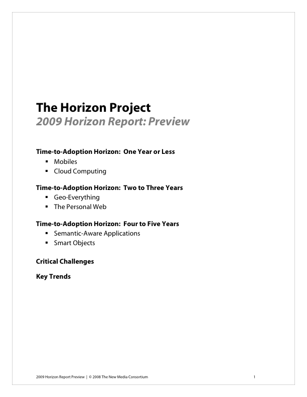We are interested in learning about any kind of research, pilot programs, innovative projects, or faculty work happening at your campus in any of the six areas listed below. (See the attached 2009 Horizon Report Preview of the topics for more details.) Our goal is to help readers understand the potential impact of these technologies and their applications on teaching, learning, or creative expression.